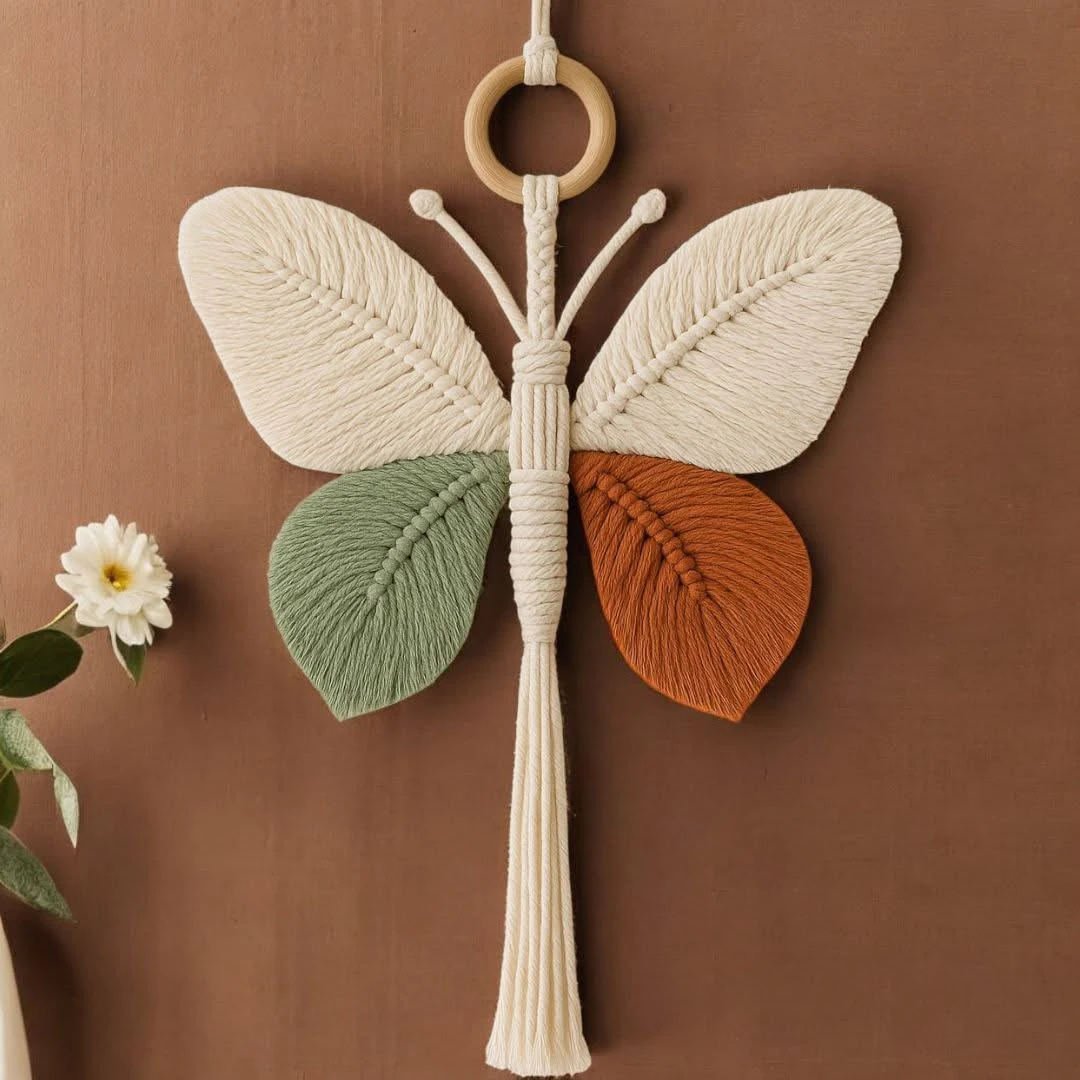 Bring a touch of nature and elegance into your space with this charming butterfly macramé wall hanging. Expertly crafted from 100% high-quality cotton cord and accented with a natural wooden ring, this piece features delicate knotted wings in cream, sage green, and rust hues, symbolizing beauty and transformation.