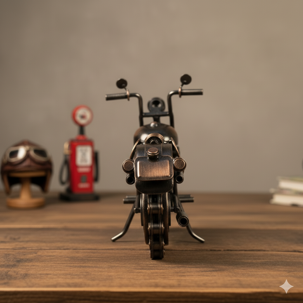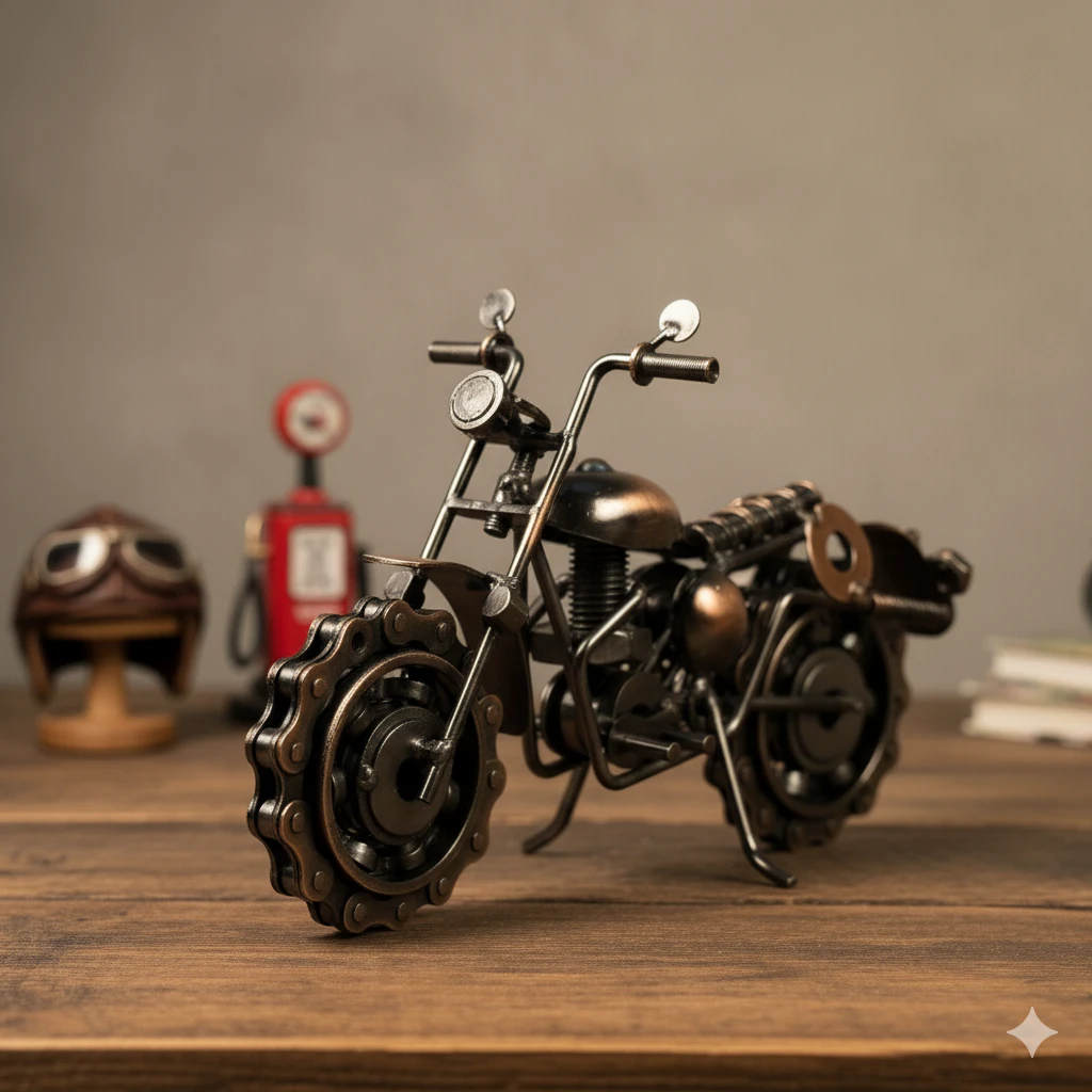 Celebrate creativity and craftsmanship with this handmade metal bike model, crafted from waste metal by skilled Indian artisans. Each piece is uniquely designed, showcasing the raw beauty of upcycled materials and the artistry of Indian workshop traditions. With intricate detailing and a rugged, industrial look, this miniature bike is a perfect decor accent for desks, shelves, or gifting to bike enthusiasts.